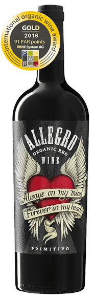 Allegro Primitivo is een volle biologische rode wijn met interessante rijk aroma’s van pruimen en chocolade. Intense en toch goed gebalanceerde smaak met knapperige tonen van donkere bessen, specerijen en vanille. Gaat erg goed met rood vlees, gevogelte, wild en kaas. De Primitivo druiven worden met de hand geplukt en biologisch geteeld. De gisting gebeurt in roestvrijstaal gevolgd door een rijping van 6 maanden op Frans eiken.