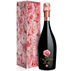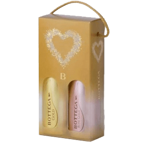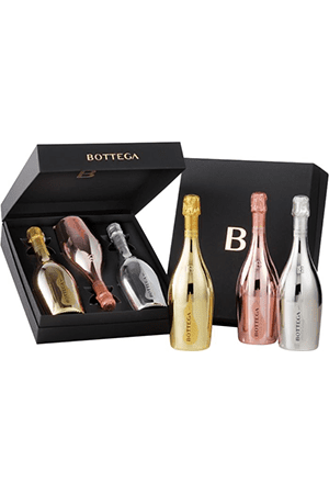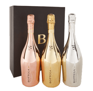 Diese luxuriöse Bottega-Geschenkbox enthält nicht weniger als drei wunderschöne Flaschen Prosecco: Gold, Gold Rosé und den exklusiven (= sehr begrenzt verfügbaren) White Gold Venezia Spumante Brut.